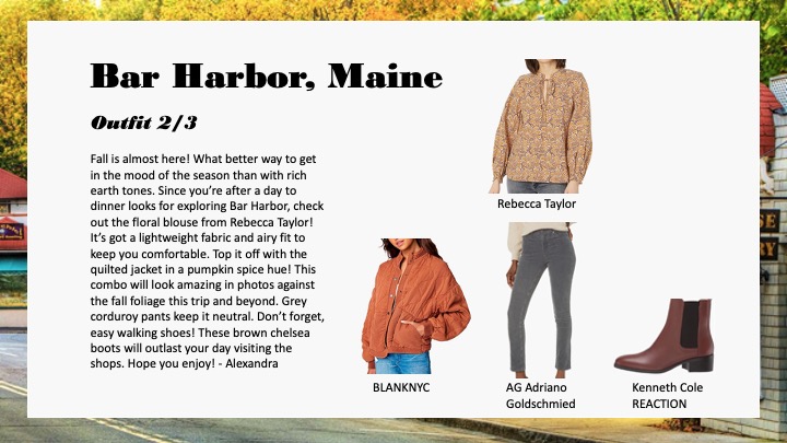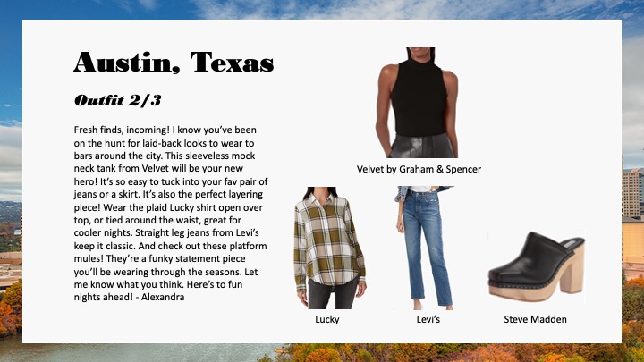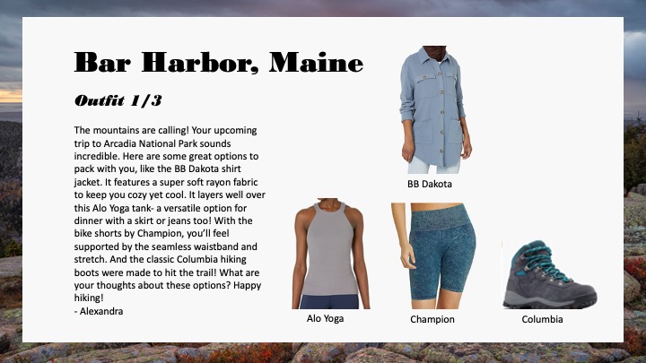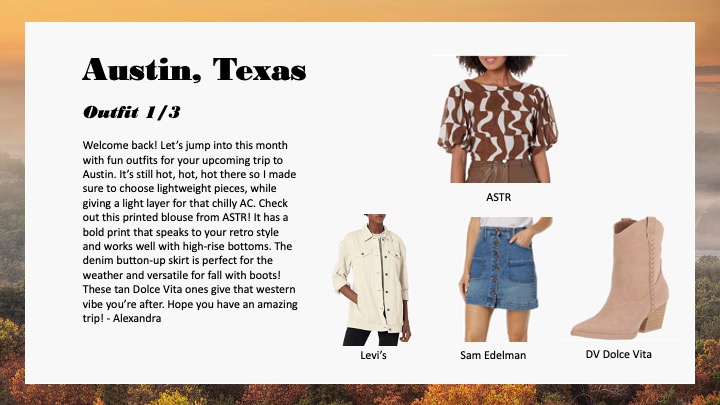 My styling work for Amazon, specifically personalized customer outfitting and notes involving customer data are confidential and cannot be shared externally as per company policy. However, here are some styling samples from the decks I created for team inspiration and example.