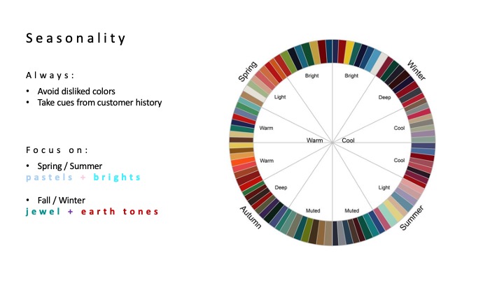 Here, I established best practices including outfitting techniques and color palette curation to improve team processes, and increase both sales and customer satisfaction. I also created and presented a Color Theory training from my education at SCAD and experience working with Pantone swatches at Nordstrom, to educate peers and new hires on how to style outfits with color cohesion. As a Training Ambassador and QC, I ensured our seasonal styling strategies aligned cross-functionally across Amazon Fashion by editing team outfit curations. My trend forecasting and data analysis skills were very important to this role. I analyzed product performance data and market trends to create monthly trend decks with successful products to boost individual and team sales. And as a top performing stylist, I coached peers on customer-focused styling strategies.